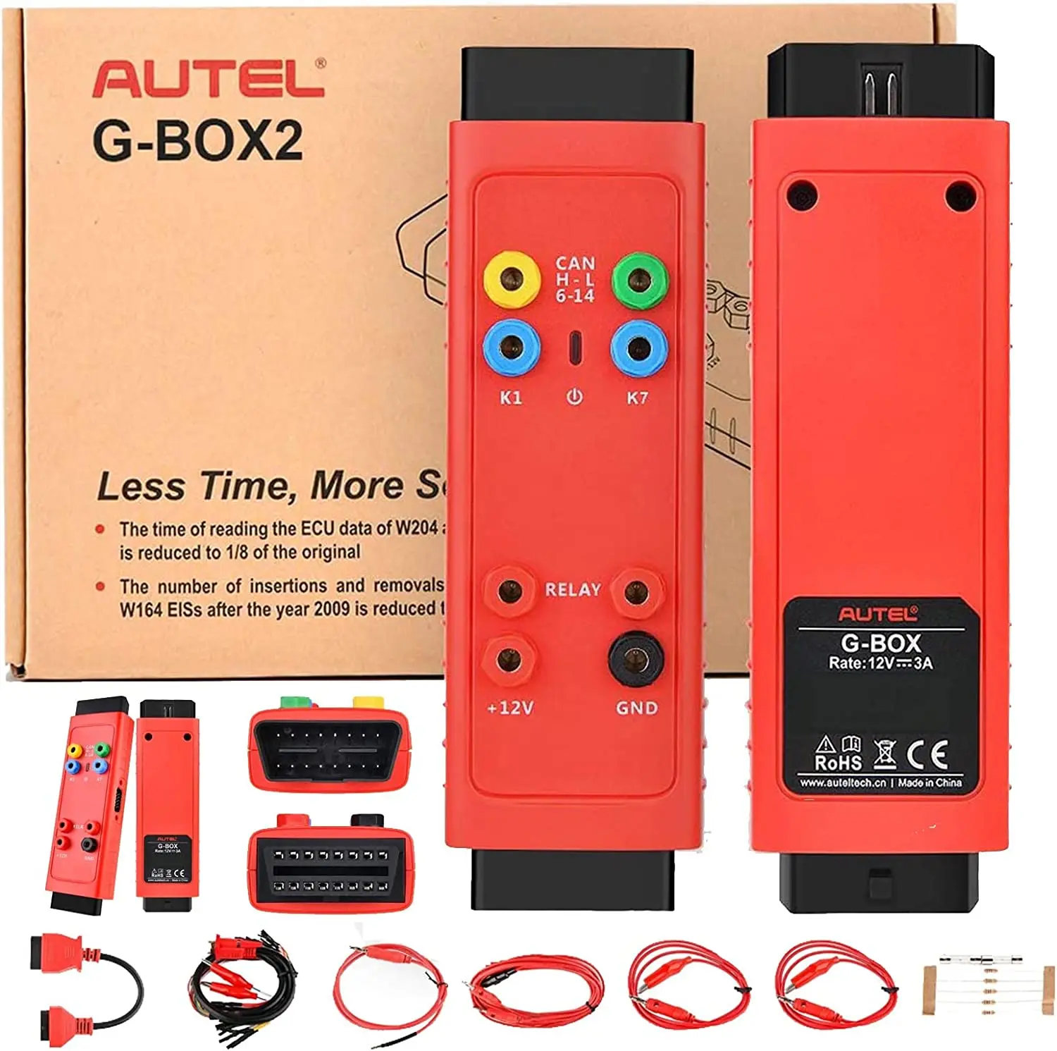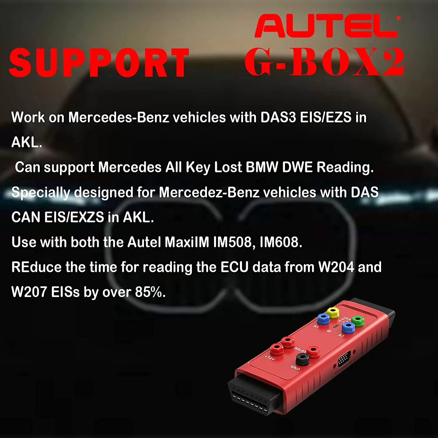 The Autel G-BOX2 is an adapter compatible with Autel's IM508 (with purchase of XP400 programmer) and IM608 Key Programming tablets used to aide in the programming keys for Mercedes DAS3 CAN EIS/EXS in an ALL Keys Lost situation. The G-Box2 also supports DME/DDE ISN Reading and Writing in Boot Mode on applicable BMW vehicles. Bench Method is also supported. All Keys Lost password calculations are 4x to 8x faster. Moreover, the number of insertions and removals of W216 and W164 EISs after the year 2009 is reduced to zero, greatly simplifying the operation steps. It can be used in Boot Mode or Bench Method. G-BOX2 needs to be used with the Autel IM508 or IM608 for reliable performance.