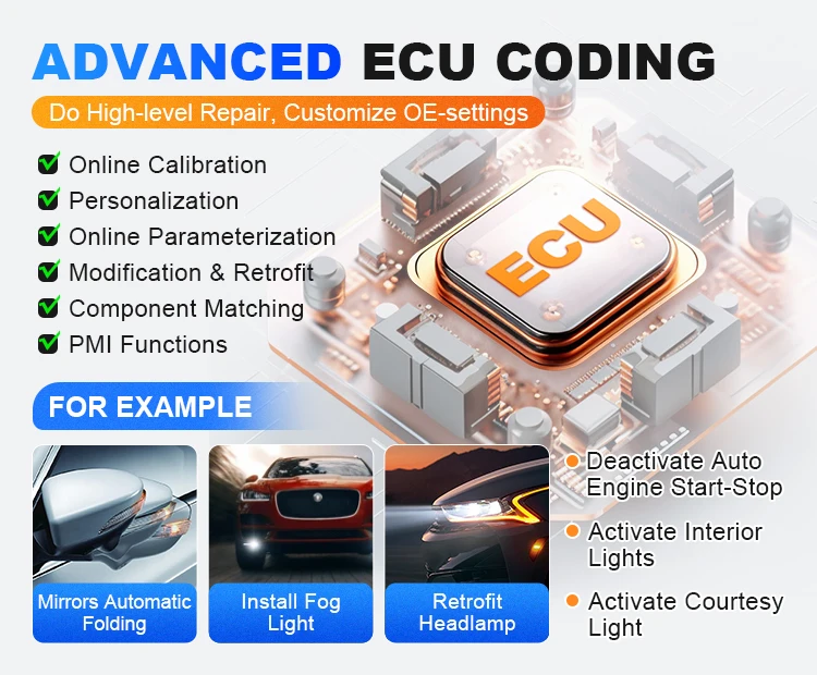 Powerful Diagnostics, Cheaper Spending;Advanced Coding, Personalize Car Needs;38+ Services Do Adaptation+ Initialization + Matching; Optimized Hardware, Go Faster & Stable Efficiency;All-System Diagnostics & Bi-directional Control, Best Trouble-Solver;FCA Car Safe Diagnostic Tool, Extension Modules;Quick Guided Functions & Intelligent VIN Identification